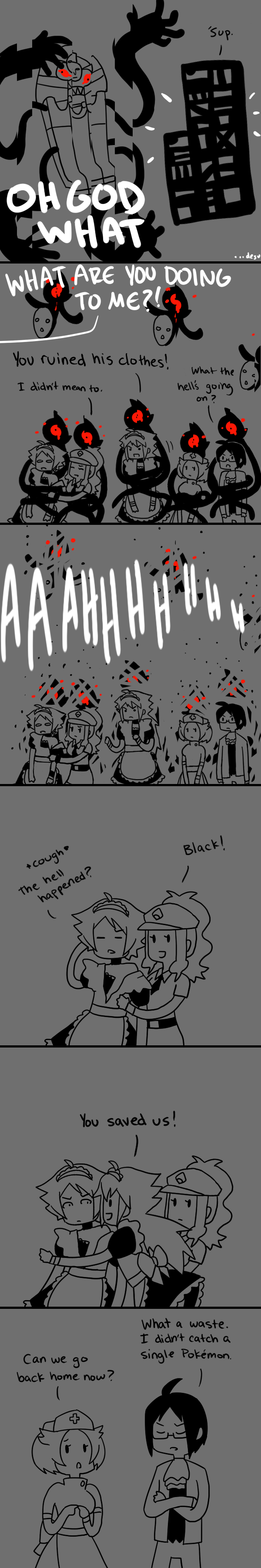 Lol White tore Black’s maid outfit XD wait that reminds me of when Red tore his shirt off ON PURPOSE during the FRLG manga which totally made me think Red was hot for that moment then the moment past and I went back to N no Silver no Pearl Ugh! Why do the rivals haft to be so hot!?