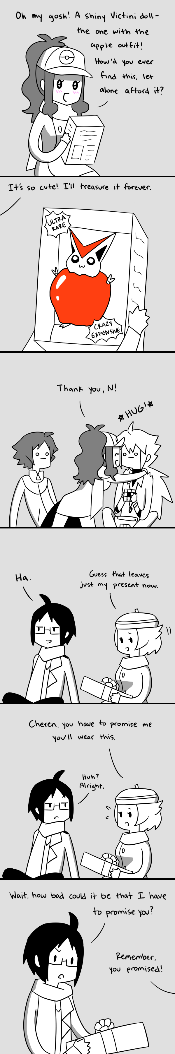 My immediate thought- “Cheren should wear a maid outfit.” back in the Halloween episode. So that’s my guess. MAID OUTFIT.