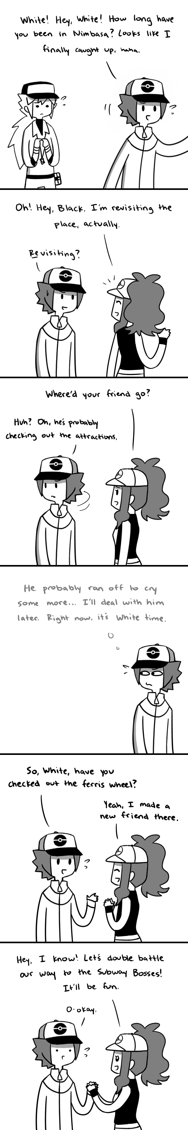 Blaaaaaack this isn’t the time for “White Time”- you need to go cheer up N!!! And White’s got a new friend huh? Perhaps Dirk or Austin or Martin?