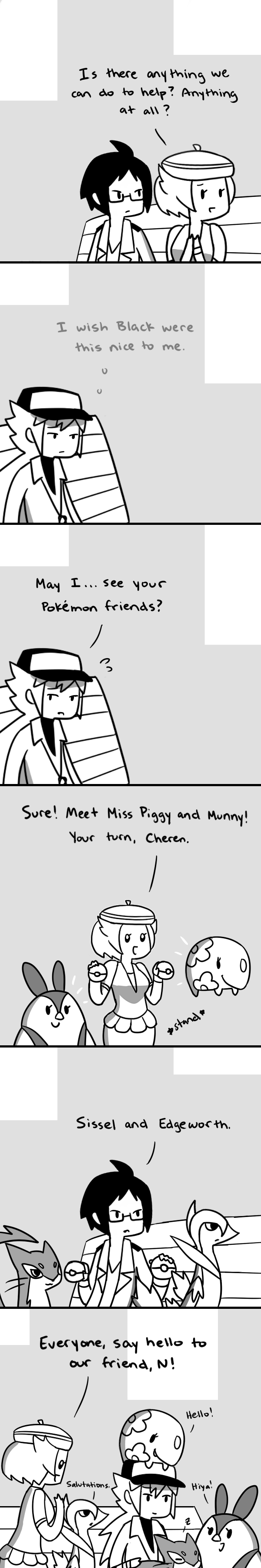 I LOVE how Cheren names all of his pokemon after characters from capcom games. Sissel from Ghost Trick and Edgeworth from Phoenix Wright