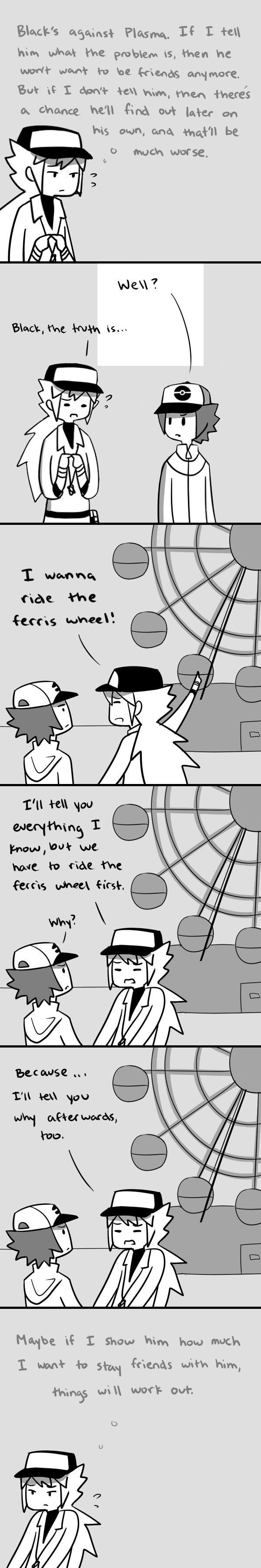 Awww….. poor N! He looks so sad, and he cares about being Black’s fwend so much! But if I were Black, I’d think N seemed kinda gay when he said “I’ll tell you why afterward (why I wanted to go on the ferris wheel…).” Oh, this is the best!