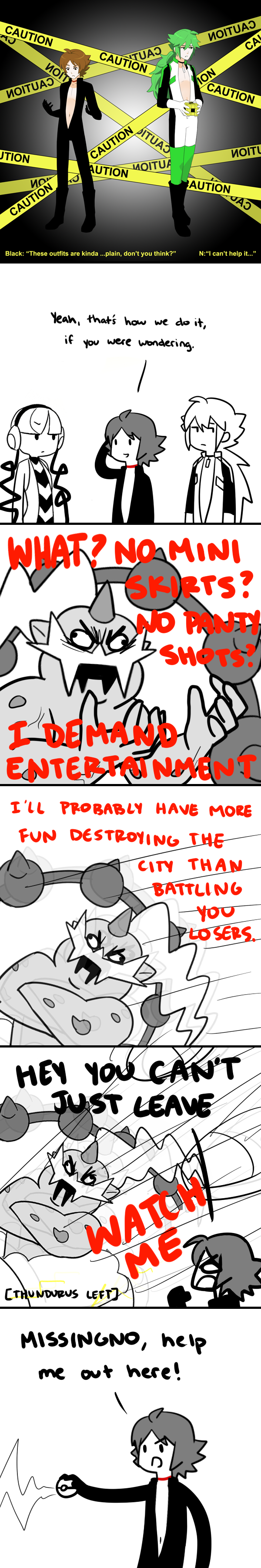 Thunderus just pulled the Y U NO pose, and Black and N’s outfit is a super low V neck? God I love you.