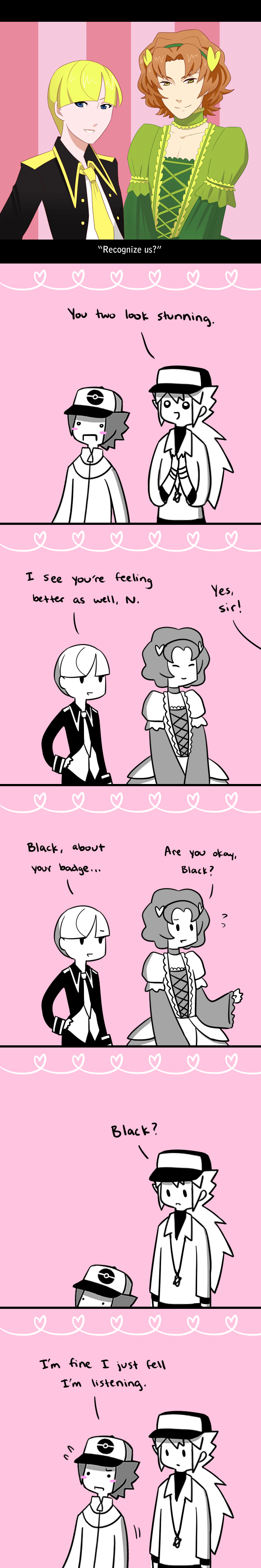 Oh boy if it wasn’t for Elesa’s wider hips I’d think she was a guy. And Arti looked so good in that dress that Black’s legs gave way. I think mine would have too.