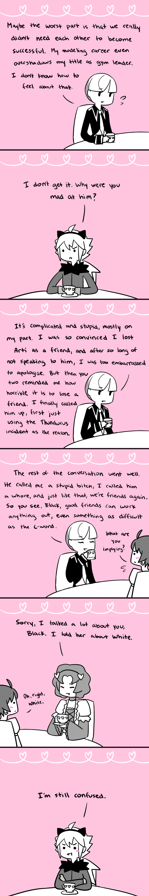 “What are you implying?” Oh, Black. After all that manly bonding over love and art you did with Arti, you jump to the conclusion that Elesa’s talking about you and N?