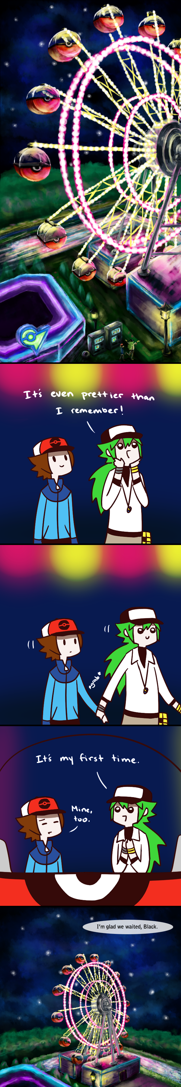THIS PLEASES ME GREATLY. Considering that, when I did a run on Pokemon Black, I waited until nightfall to ride the Ferris Wheel with N because I wanted to see the neon. I was disappoint when I found out the Ferris Wheel didn’t light up at night in the game. BUT THIS COMIC HAS BREATHED NEW LIFE INTO MY SOUL. I CAN NOW DIE HAPPY.