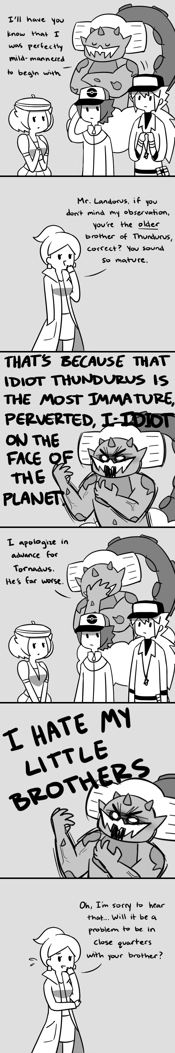 Anyway, I love Landorus XD That facepalm made me laugh so hard. and the “I HATE MY LITTLE BROTHERS” panel. Yay foreshadowing!