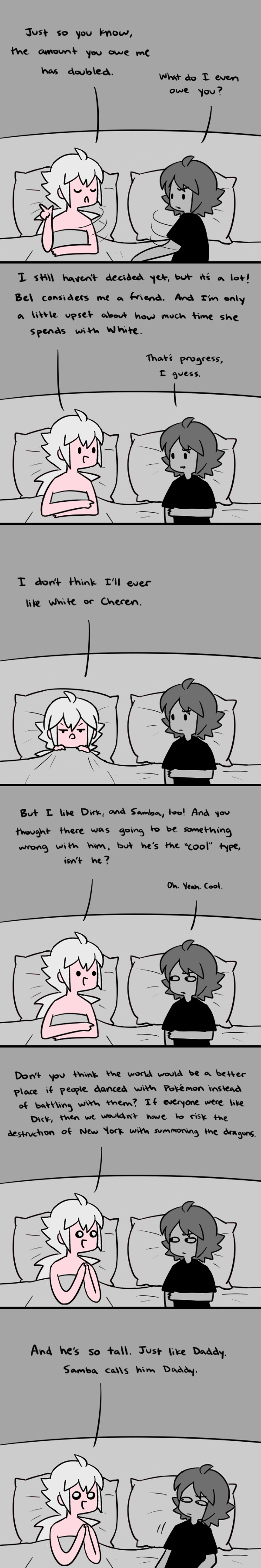 N in the third panel… Man that face. I adore it. And I like how Black just gets progressively creeped out until he scoots away in the last panel XD