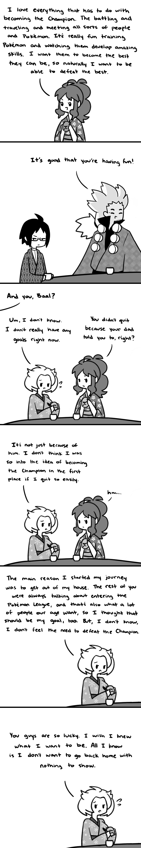 The name ‘Bel’ means ‘White’ in some language, and the color White isn’t a color at all, it’s actually every color at once, so Bel should become everything she wants at once……a Researcher/Doctor/ Champion/Ninga/Pop star! And then she’ll be happy~!