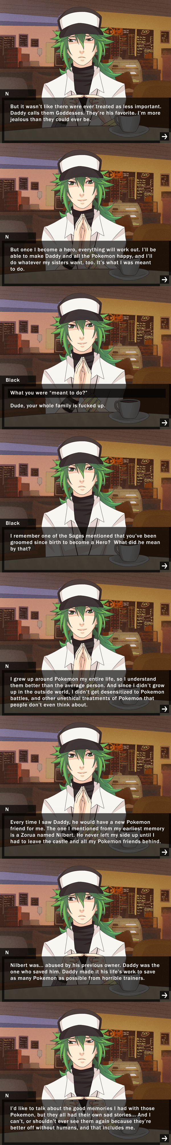 Author!Black made an April Fools Deviation on Deviantart, where N plays a prank on Black by saying that his Zorua (Disguised as a Black-looking kid with green hair) was their son. Black fainted. Later on, Author!Black named him Nilbert, a combo of N and Hilbert. (Black’s other name.)