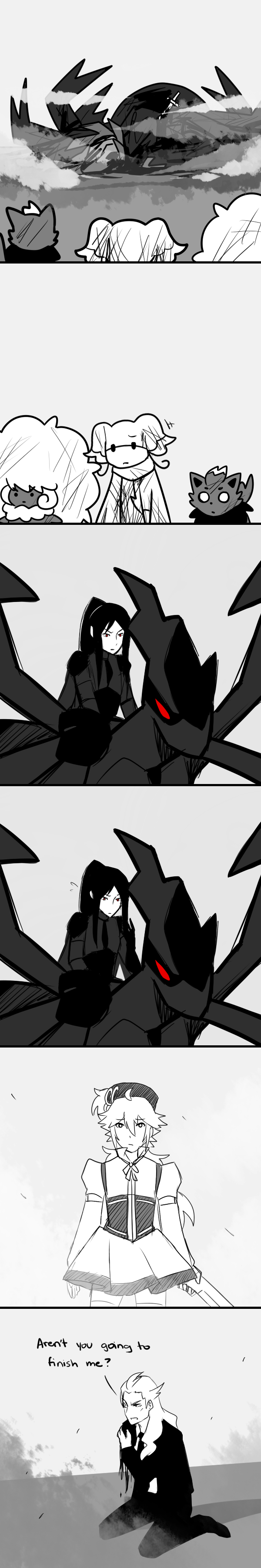 Wouldn’t it make more sense that Mary is Sayaka since she is supposedly throwing her sword(s), KCALB is the closest to Kyoko because nobody is closer to having a lance, Gaychese (calling him that because I am too lazy to look up his name and spell it correctly) is closest to Mami because N has his cube, I forgot the proper name sadly, and it has the ability to bend space and time anyways to cause these parodies so it would make more sense to say N is Homura even though he has Mami’s weapons. I could be way off on this speculation of course though considering Homura did get Madoka’s bow at one point too.
