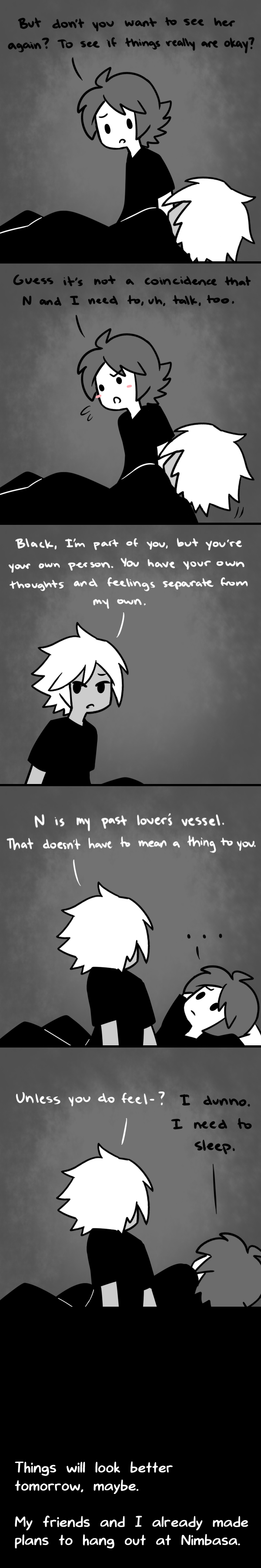 things are awkwardly winding down it seems. but i can’t help but wonder what will become of N and Blacks relationship. also yay update! Wait I’m confused was Kcalb actually the hero of light or was he a separate entity. and finally i don’t know what it it about the hero of light but i want to play with his hair….