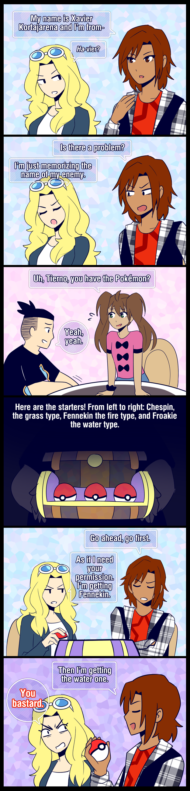 Yeah, it seems odd to me that the one with the shitty attitude is the one with the type disadvantage. Usually the asshat rival picks the pokemon with a type advantage just to be a dick, though Xavier could arguably be fitting that role nicely with that last comment.