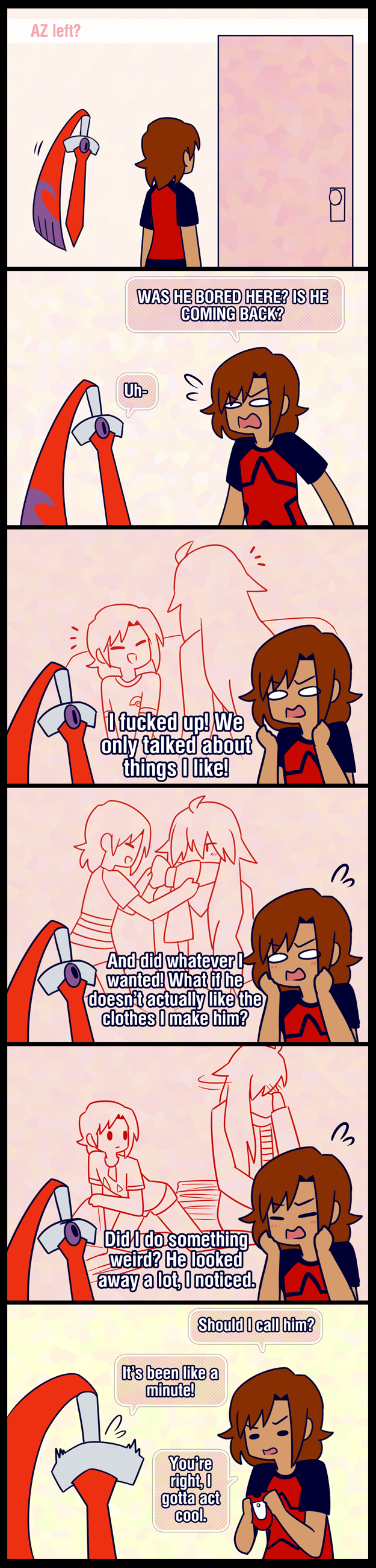 Hey there! I just decided to see if my favorite webcomic updated, and it did! Like today, too! I just. Want Az to send really cute texts to xavi. Or maybe like more honest ones to him +_+ like telling him he’ll protect him and stuff. And does Lysandre care about Sycamore in a more romantic way?! I loved his “dont say things like that” bit. I see it in the way that he loves Augustine but also aknowledges he probably isnt a good fit. Aah! Tbh the latest generations episode reminded me of this comic. I thought “did black see this yet? I miss Az!”