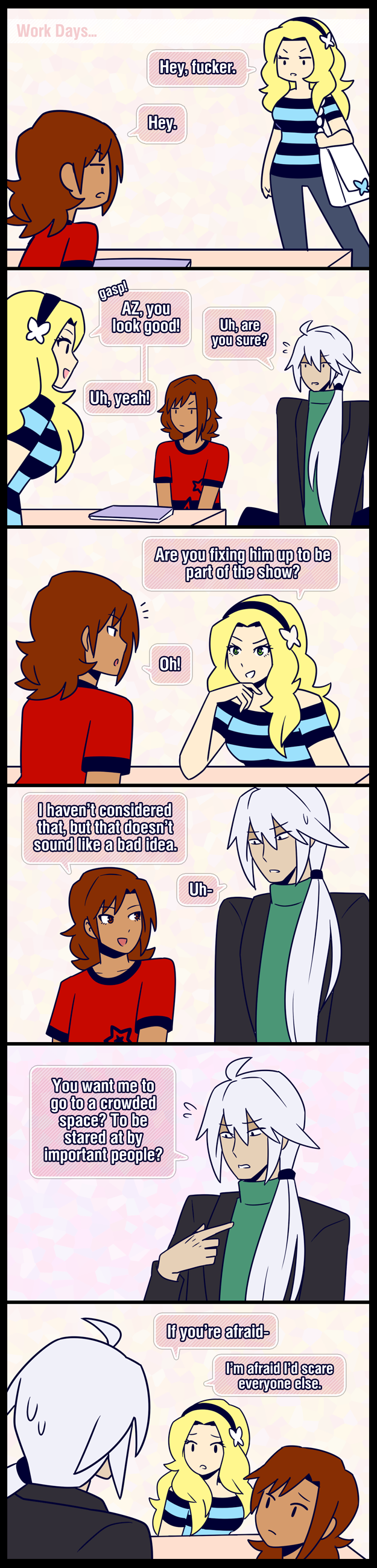 I want Yvonne and Xavier to be friends by the end of the comic, but for them to still be really competitive and rude with each other. Like, the kind of friendship where it’s like “I’ll call you bitch or fucker all day long, but if someone else does it I WILL END THEM.” Those are some of my favorite fictional friendships!